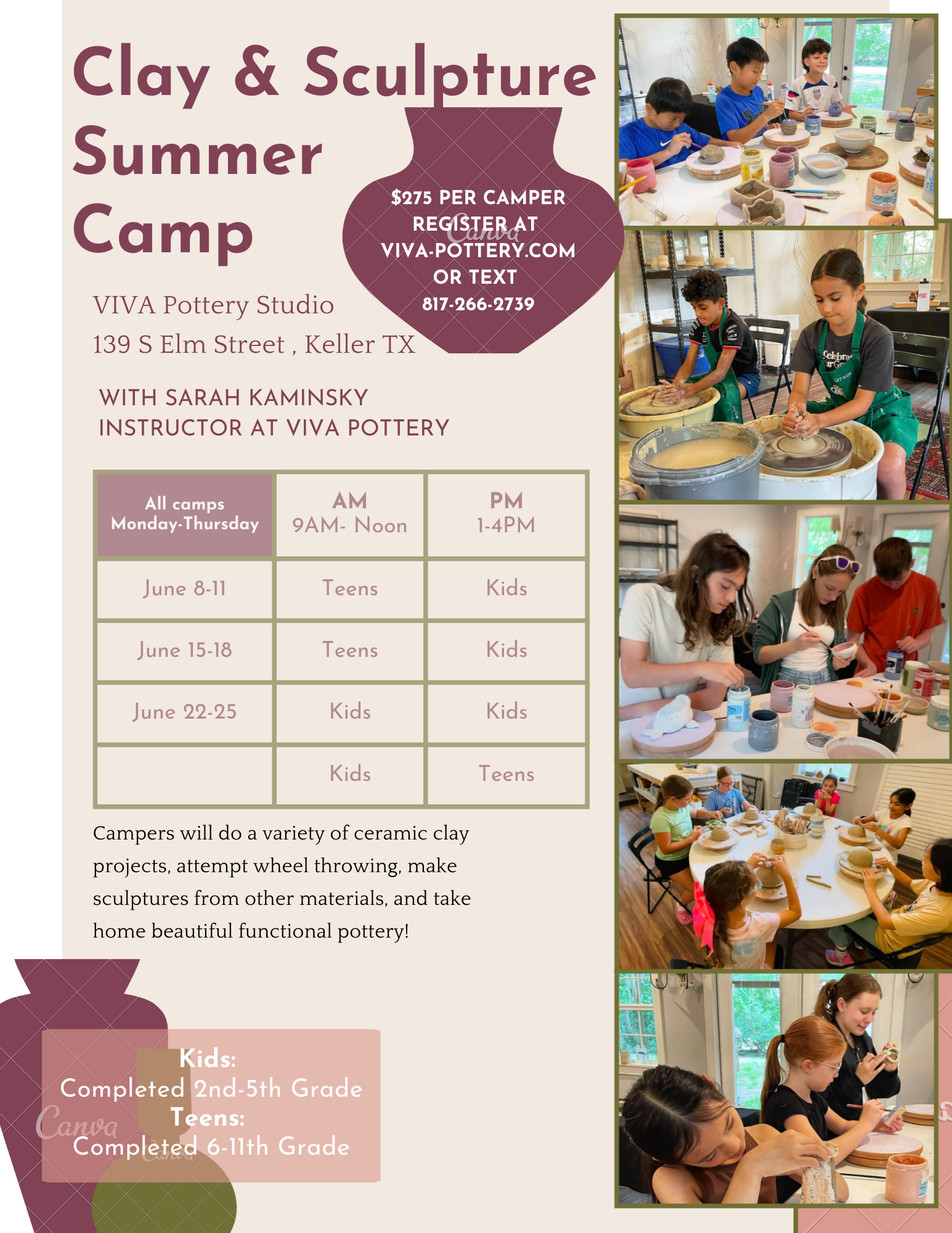 Pottery Classes for Kids 6-week sessionNew Dates: March 1 - April 5th Register for Group Class Summer Clay and Sculpture campDates Are Here!!! June 2026 Register for Group Class For Individual Wheeling Throwing Classes, contact VIVA Pottery to schedule Learn More